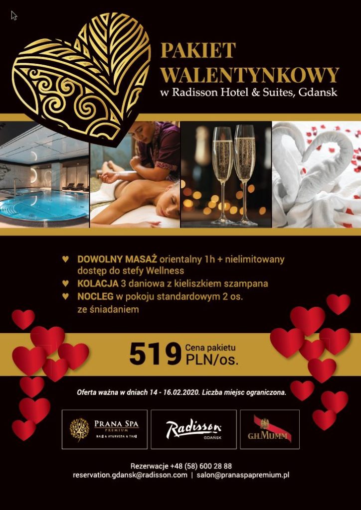 O miłość trzeba dbać. Szczególnie w dzisiejszym, zabieganym świecie, kiedy tak trudno nam wygospodarować wartościowy czas dla drugiej osoby i zatrzymać się na chwilę, by celebrować wspólne chwile we dwoje. Walentynki to czas sprzyjający miłosnym wyznaniom, pielęgnowaniu uczuć i relacji z drugą osobą. Warto oderwać się od codziennej rutyny i znaleźć czas tylko siebie. W Radisson Hotel & Suites oraz Prana Spa Premium pomożemy Ci zadbać o niepowtarzalną atmosferę i oprawę święta miłości, które według nas powinno trwać cały rok! Jeśli chcesz zrobić miłą niespodziankę ukochanej osobie – dowiedz się więcej o naszym Pakiecie Walentynkowym!