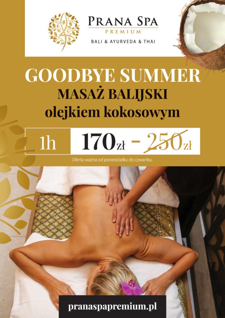 Tylko we wrześniu do uwielbianego przez naszych Gości masażu balijskiego dodajemy olejek kokosowy. Mamy nadzieję, że takie połączenie przeniesie Was na egzotyczne, tropikalne plaże z białym piaskiem oraz pochylonymi i odbijającymi się w turkusowej wodzie palmami. Zapraszamy!