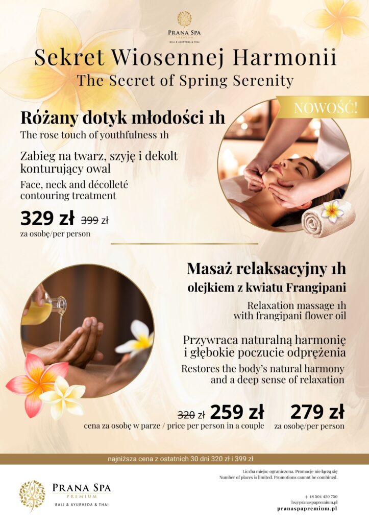 Wiosna to idealny moment, aby zadbać o regenerację ciała i skóry po zimie. W Prana Spa Premium przygotowano wyjątkową promocję na dwa popularne zabiegi – aromatyczny masaż relaksacyjny oraz luksusowy zabieg odmładzający na twarz. To doskonała okazja, aby połączyć głęboki relaks z profesjonalną pielęgnacją skóry w atrakcyjnej cenie.